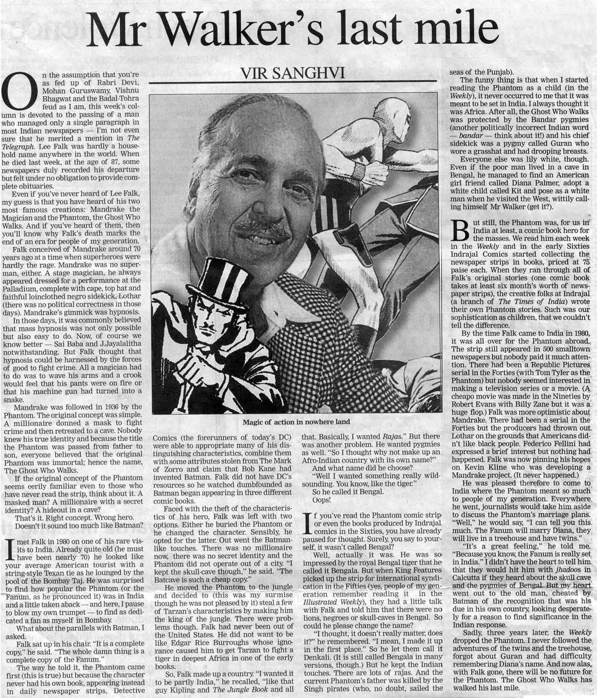 Mr Walker's Last Mile is an article by Vir Sanghvi. In it, he recollects a meeting with Lee Falk in Mumbai, India in 1980.